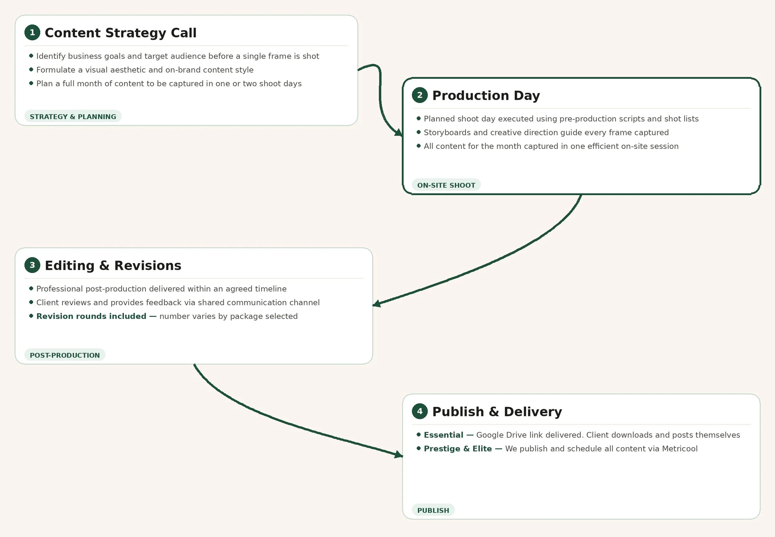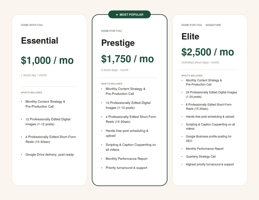 Most agencies show up and wing it. We don't. Every month starts with a dedicated content strategy call where we plan exactly what we're capturing and why. From there we move into production, post-production, and publishing — each phase built on the last so nothing is rushed, nothing is wasted, and the content we put out actually reflects the quality of your business, all without the headaches on your end.